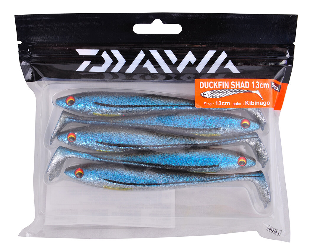 Daiwa Duck Fin Shad 13 cm Silikon Set , paket içi 5 adet özellikle Levrek ve benzeri balıklarda yüksek derece avcılığa sahip kaliteli ve uzun ömürlü silikon yem. Yem ağırlığı 2 gr dır.