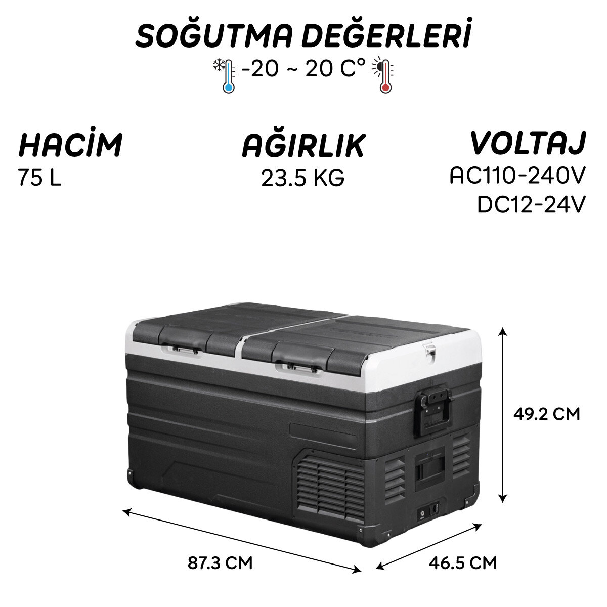 Gelince Haber VerIcepeak Alegria Kompresörlü Buzdolabı 75 litre Öne Çıkan Özellikler: Ürün Özellikleri: Soğutma değerleri: -20 ~ 20 C° Güç tüketimi: 80W Voltaj: AC110-240V, DC12-24V Gürültü seviyesi: 45dB Sıcaklık ayarı için LED ekran kontrol paneli USB Şarj portu: 5V/1A. Pil Koruma modu: H(Yüksek), M(Orta) ve L(Düşük) Soğutma modu: MAX (Hızlı soğutma) ve ECO (Enerji tasarrufu) Buzdolabı ayarlanan ısı değerine ulaştığında kompresör çalışmayı durduracaktır. Isı değeri yükseldiğinde kompresör tekrar çalışmaya başlayacaktır. Akü kullanılan ısı değerine bağlı olarak buzdolabını 4~20 saat çalışır durumda tutar Kesintisiz kullanım için solar panel ile şarj imkanı (opsiyonel) CFC (Kloroflorokarbon) içermez. Mükemmel ısı yalıtımı Titreşim önleyici tasarım Akıllı akü koruma sistemi, aracınızın aküsünün bitmesini engeller. Süper sessiz, üstün soğutma performansı sağlayan LG kompresör Bölmelerde bireysel sıcaklık kontrolü Örnek olarak sağ bölme dondurucu sol bölme buzdolabı olarak kullanılabilir. Ayrılabilir ve yönü ihtiyacınıza göre değiştirilebilir kapak tasarımı Kapak kilidi Kapakta sızıntı önleyici iç bant İç aydınlatma Kolay depolama için 2 boy tel sepet Tahliye tapası (2 bölmede ayrı olarak mevcuttur) Kapak açacağı Güçlendirilmiş kolay kavranabilen kullanışlı taşıma kulpu Koruyucu ayak pedi