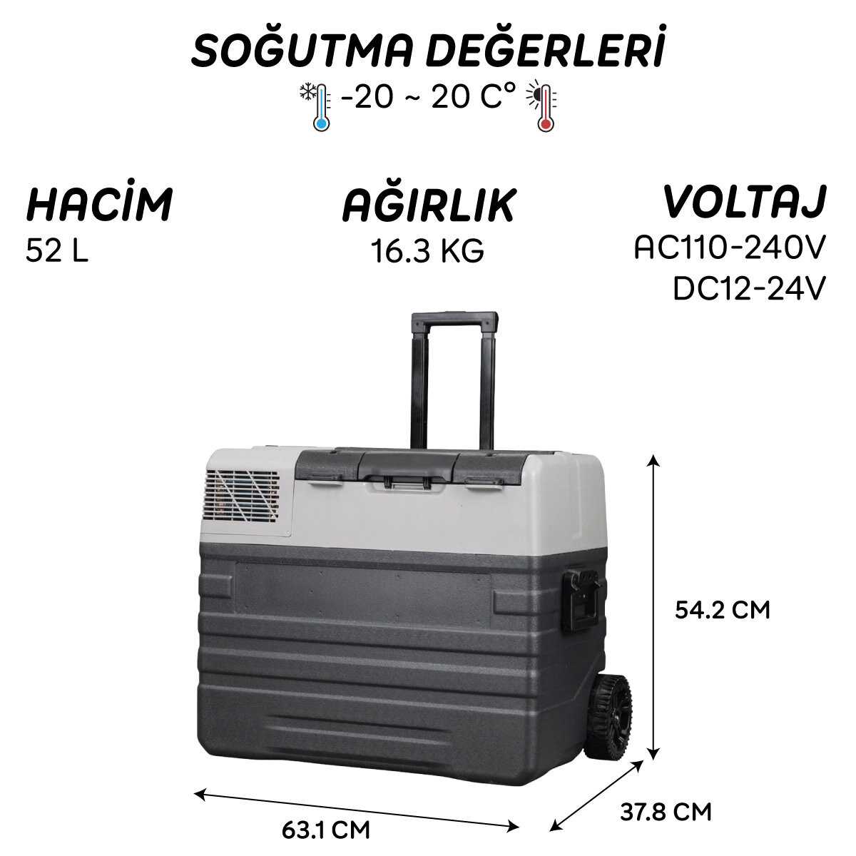 Gelince Haber VerIcepeak Lizbon Kompresörlü Buzdolabı 52 Litre Öne Çıkan Özellikler: Öne Çıkan Özellikler: Soğutma değerleri: -20 ~ 20 C° Güç tüketimi: 60W Voltaj: AC110-240V, DC12-24V Gürültü seviyesi: 45dB Sıcaklık ayarı için LED ekran kontrol paneli USB Şarj portu: 5V/1A. Pil Koruma modu: H(Yüksek), M(Orta) ve L(Düşük) Soğutma modu: MAX (Hızlı soğutma) ve ECO (enerji tasarrufu) Buzdolabı ayarlanan ısı değerine ulaştığında kompresör çalışmayı durduracaktır. Isı değeri yükseldiğinde kompresör tekrar çalışmaya başlayacaktır. Akü kullanılan ısı değerine bağlı olarak buzdolabını 4~20 saat çalışır durumda tutar Kesintisiz kullanım için solar panel ile şarj imkanı (opsiyonel) CFC (Kloroflorokarbon) içermez. Mükemmel ısı yalıtımı Titreşim önleyici tasarım Akıllı akü koruma sistemi, aracınızın aküsünün bitmesini engeller. Süper sessiz, üstün soğutma performansı sağlayan LG kompresör Ayrılabilir ve yönü ihtiyacınıza göre değiştirilebilir kapak tasarımı Kapak kilidi Kilitlenebilir kapak Kapakta sızıntı önleyici iç bant İç aydınlatma Tahliye tapası Kapak açacağı Kapakta telefon - tablet standı Kapakta 4 adet bardak koyma yeri Kolay kavranabilen kullanışlı teleskopik çekme kolu Hareket kolaylığı sağlayan çıkarılabilir büyük tekerlekler