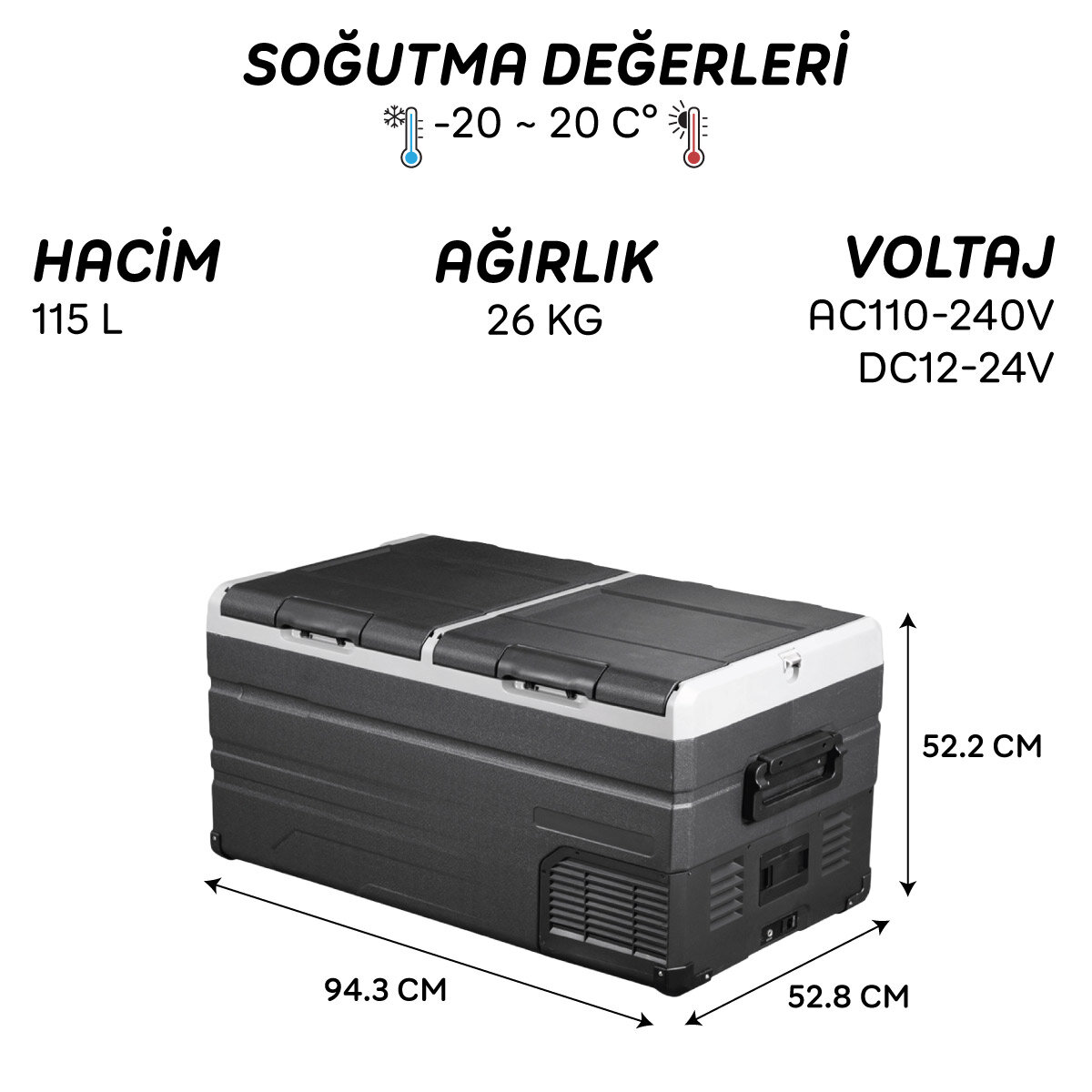 Gelince Haber VerIcepeak Rocha Kompresörlü Buzdolabı 115 Litre Öne Çıkan Özellikler: Ürün Özellikleri: Soğutma değerleri: -20 ~ 20 C° Güç tüketimi: 80W Voltaj: AC110-240V, DC12-24V Gürültü seviyesi: 45dB Sıcaklık ayarı için LED ekran kontrol paneli USB Şarj portu: 5V/1A. Pil Koruma modu: H(Yüksek), M(Orta) ve L(Düşük) Soğutma modu: MAX (Hızlı soğutma) ve ECO (Enerji tasarrufu) Buzdolabı ayarlanan ısı değerine ulaştığında kompresör çalışmayı durduracaktır. Isı değeri yükseldiğinde kompresör tekrar çalışmaya başlayacaktır. Akü kullanılan ısı değerine bağlı olarak buzdolabını 4~20 saat çalışır durumda tutar Kesintisiz kullanım için solar panel ile şarj imkanı (opsiyonel) CFC (Kloroflorokarbon) içermez. Mükemmel ısı yalıtımı Titreşim önleyici tasarım Akıllı akü koruma sistemi, aracınızın aküsünün bitmesini engeller. Süper sessiz, üstün soğutma performansı sağlayan LG kompresör Bölmelerde bireysel sıcaklık kontrolü Örnek olarak sağ bölme dondurucu sol bölme buzdolabı olarak kullanılabilir. Ayrılabilir ve yönü ihtiyacınıza göre değiştirilebilir kapak tasarımı Kapak kilidi Kapakta sızıntı önleyici iç bant İç aydınlatma Kolay depolama için 2 boy tel sepet Tahliye tapası (2 bölmede ayrı olarak mevcuttur) Kapak açacağı Güçlendirilmiş kolay kavranabilen kullanışlı taşıma kulpu Koruyucu ayak pedi