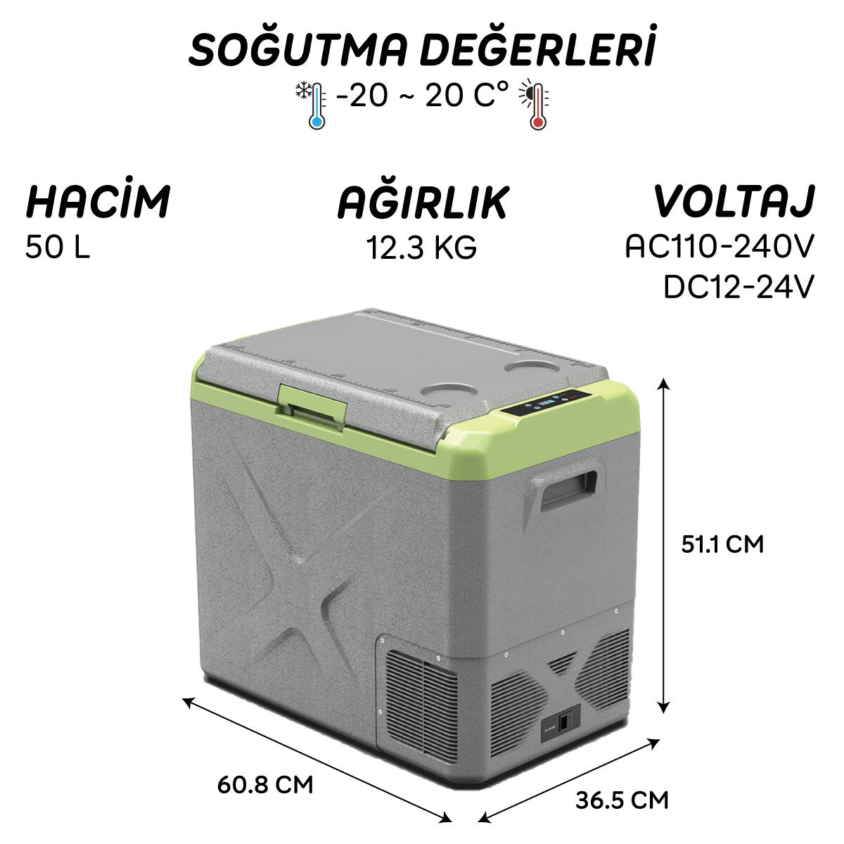 Gelince Haber VerIcepeak Viyana Kompresörlü Buzdolabı 50 Litre Öne Çıkan Özellikler: Ürün Özellikleri: Soğutma değerleri: -20 ~ 20 C° Güç tüketimi: 80W Voltaj: AC110-240V, DC12-24V Gürültü seviyesi: 45dB Sıcaklık ayarı için LED ekran kontrol paneli USB Şarj portu: 5V/1A. Pil Koruma modu: H(Yüksek), M(Orta) ve L(Düşük) Soğutma modu: MAX (Hızlı soğutma) ve ECO (Enerji tasarrufu) Buzdolabı ayarlanan ısı değerine ulaştığında kompresör çalışmayı durduracaktır. Isı değeri yükseldiğinde kompresör tekrar çalışmaya başlayacaktır. CFC (Kloroflorokarbon) içermez. Mükemmel ısı yalıtımı Titreşim önleyici tasarım Akıllı akü koruma sistemi, aracınızın aküsünün bitmesini engeller. Ayrılabilir ve yönü ihtiyacınıza göre değiştirilebilir kapak tasarımı Kapak kilidi Kapakta sızıntı önleyici iç bant Kapakta ölçüm cetveli Kapakta 4 adet bardak koyma yeri Tahliye tapası Dahili taşıma kulpu