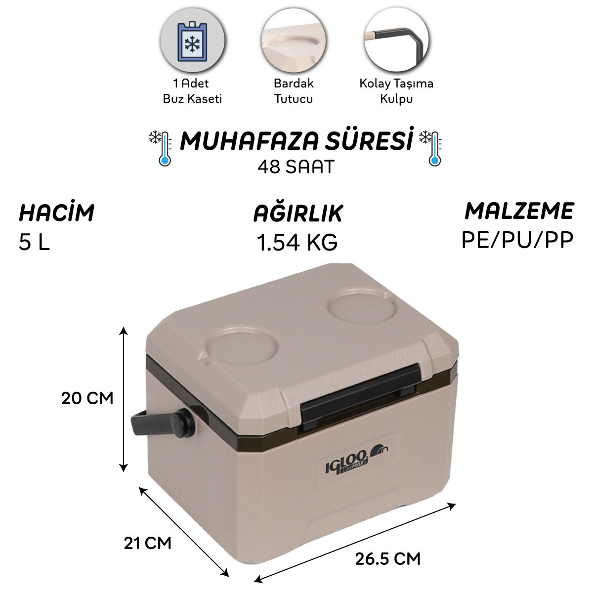 Hacim: 5 Litre (5.28QT)Net Ağırlık: 1.54 kgBrüt Ağırlık: 1.8 kgDış Ölçüler: 21 (En) x 26.5 (Boy) x 20 (Yükseklik) cmİç Ölçüler: 16 (En) x 24.5 (Boy) x 14.5 (Yükseklik) cmKoli Ölçüleri: 24 (En) x 30.5 (Boy) x 21.5 (Yükseklik) cmSoğuk Tutma Süresi: 48 Saat (Kullanıma Bağlı Olarak Değişkenlik Gösterebilmektedir.)Malzeme: PE/PU/PPYalıtım Malzemesi: Poliüretan KöpükDâhili 1 Adet Buz Kaseti (Dipfrizde Dondurup Kullanmanız Önerilir. Buz Kaseti Ölçüleri : 13 (En) x 21 (Boy) x 2.2 (Yükseklik) cm Buz Kaseti Litresi: 330 ml (462g)