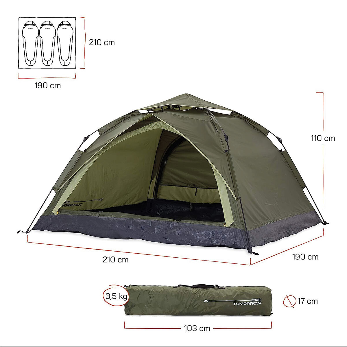 Where Tomorrow Doppel Otomatik Çadır 3 Kişilik Aile Çadırı Doppel ile Kamp, yürüyüş, geziler ve akla gelebilecek her türlü Outdoor aktivitesi için ideal. Montajı kolay, hafif ve sağlam. Marka: Where Tomorrow Model: Doppel Çadır Kurulumu: Otomatik kurulum En: 210 cm Boy: 190 cm Yükseklik: 110 cm Kapı Bilgisi: 1 kapı Bagaj: Bagaj Özelliği Bulunmamaktadır. Kapalı Ölçüsü: 14 x 102 cm Ağırlık: 3300g Kişi Sayısı: 3 Kişilik Oda Sayısı: 1 Oda Mevsim: 4 Mevsim Kumaş Tipi: 190T polyester PU2000mm Taban Kumaşı: 115G PE Pole: 8.5 mm Detaylar: Kurulum: Kapatma: İşte bu kadar!